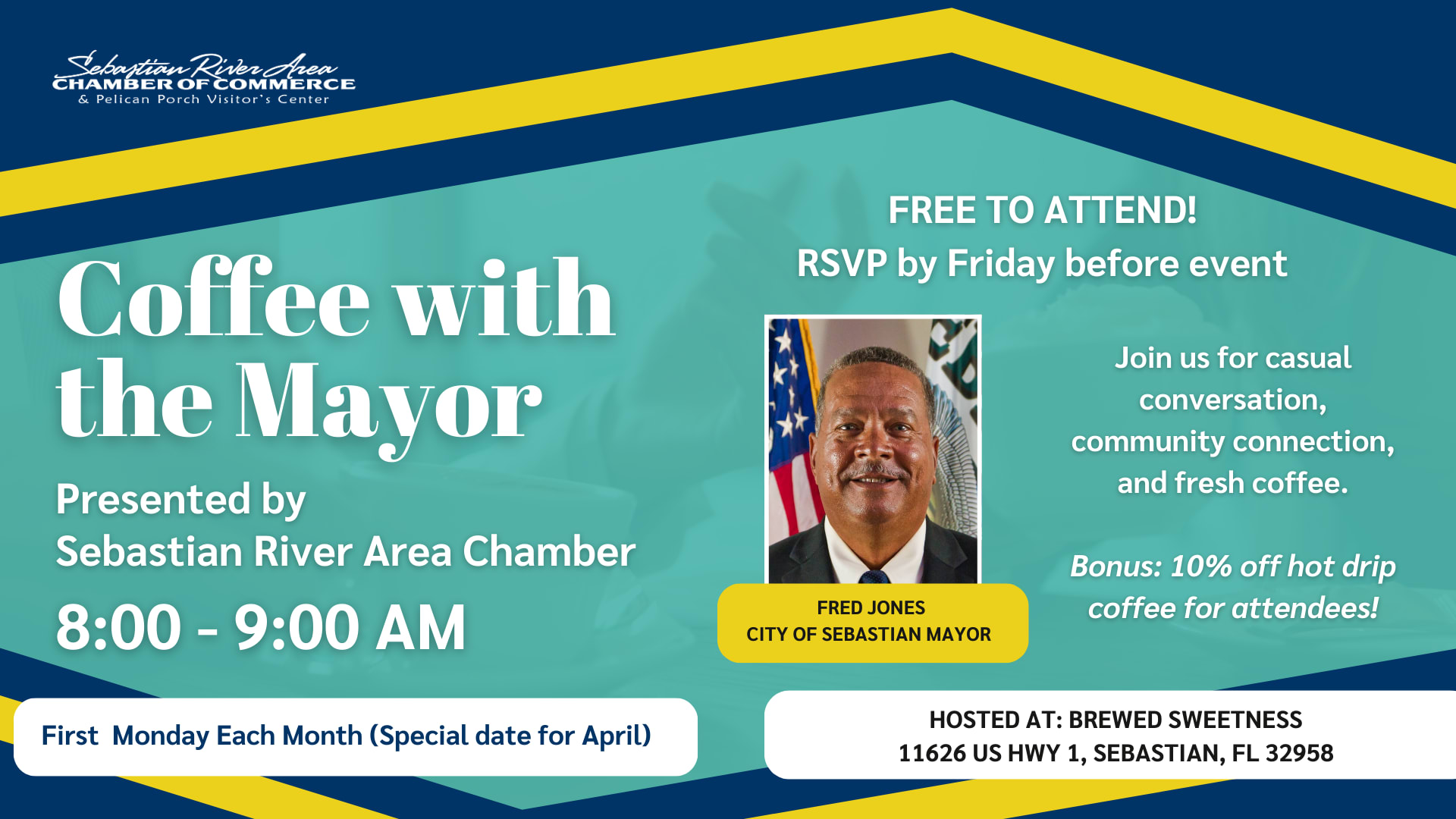 Join us at Brewed Sweetness to connect with Mayor Fred Jones in a relaxed, conversational setting to talk about all things SEBASTIAN!