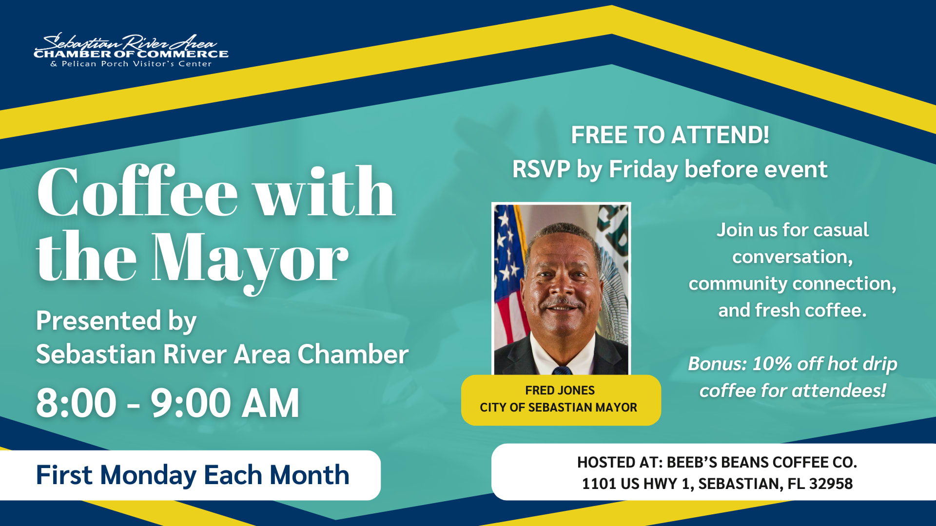 Join us at Beeb's Beans to connect with Mayor Fred Jones in a relaxed, conversational setting to talk about all things SEBASTIAN!