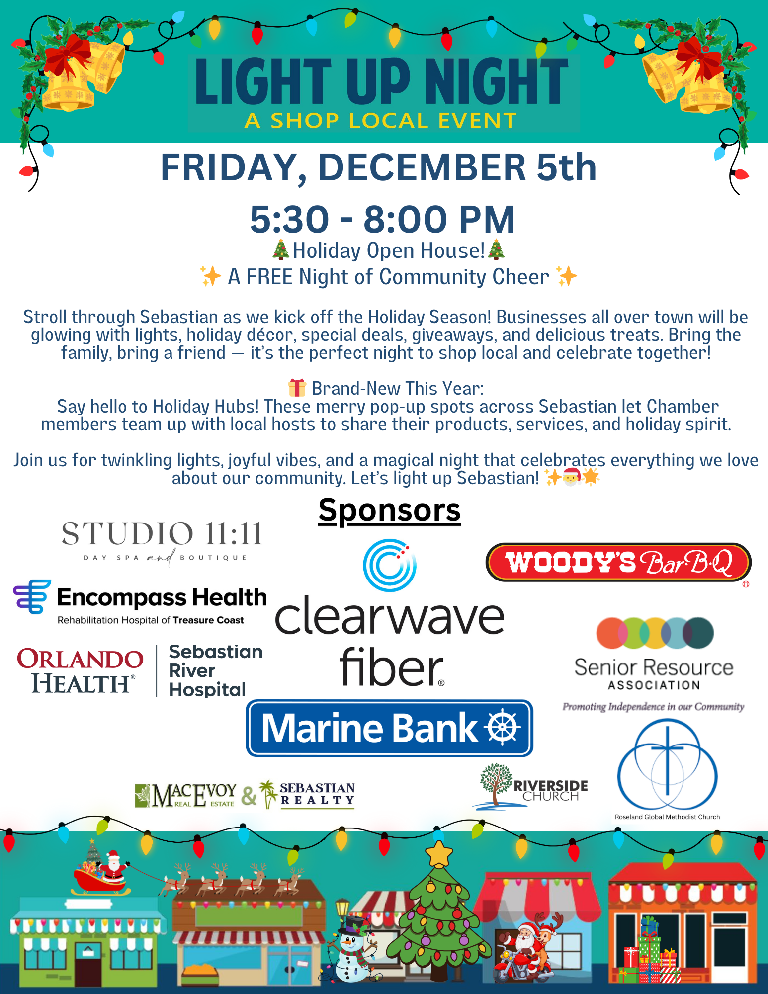 ✨ Presented by the Sebastian River Area Chamber of Commerce, this beloved community tradition marks the official start of the Holiday Season! Join us for a festive evening as local businesses keep their doors open late, lighting up the night with dazzling decorations, special sales, door prizes, and complimentary food, refreshments, and family fun.