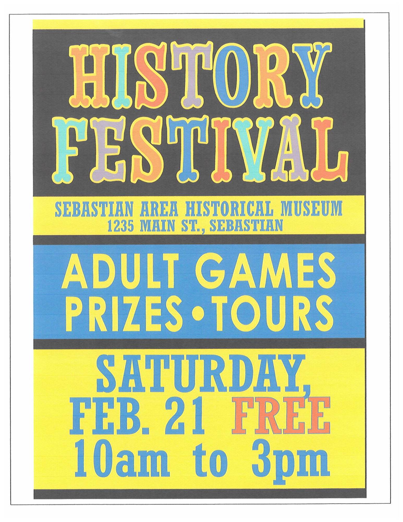 The Sebastian Area Historical Society is proud to announce that w will be celebrating a "History Festival" at the Sebastian Area Historical Museum in the Old Elementary School at 1235 Main Street, Sebastian on Saturday, February 21st from 10a.m. to 3p.m. Admission is free and we will have an adult scavenger hunt in the museum as well as games and prizes throughout the day. At 2:30p.m. we will b raffling off a complete set of the Tales of Sebastian books for free.