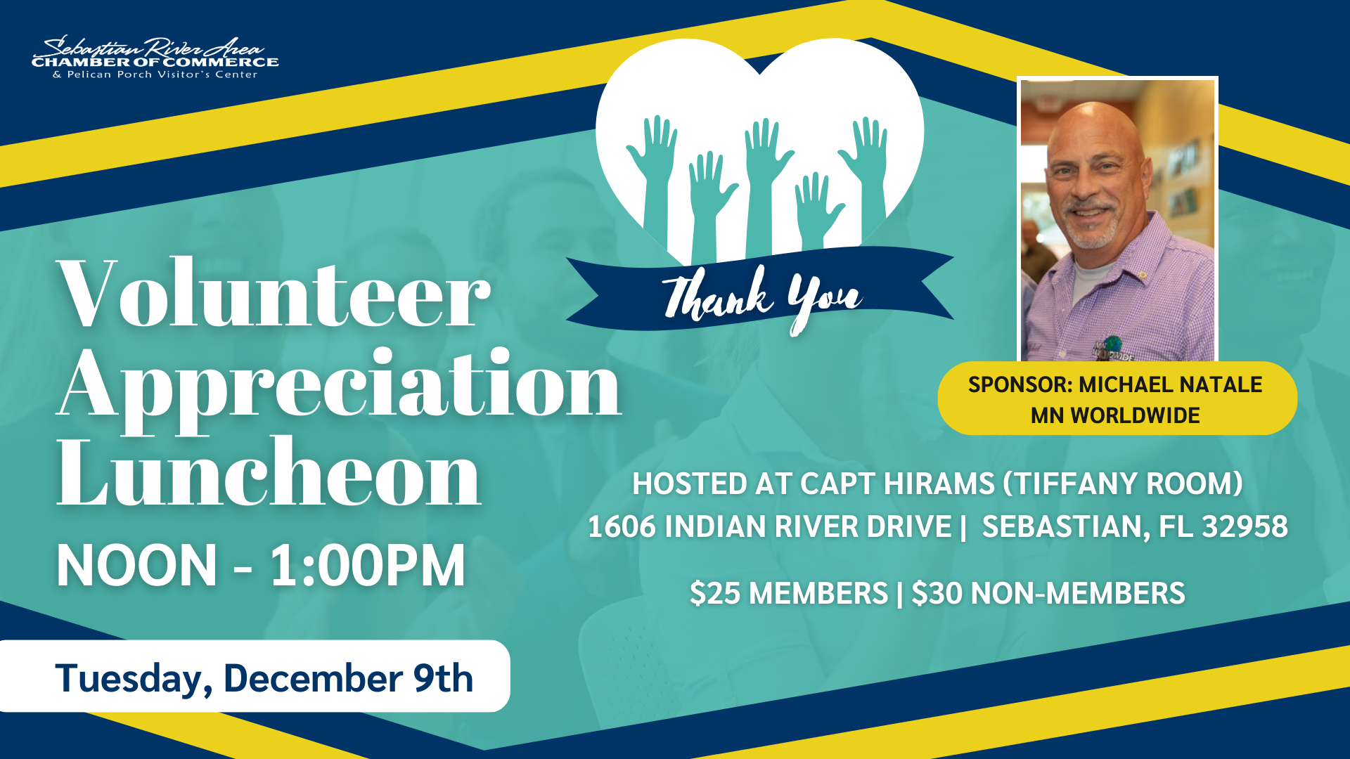 Nominations are being accepted through December 1, 2025. Email ceo@sebastianchamber.com to nominate a volunteer to be recognized. 12 spots available.