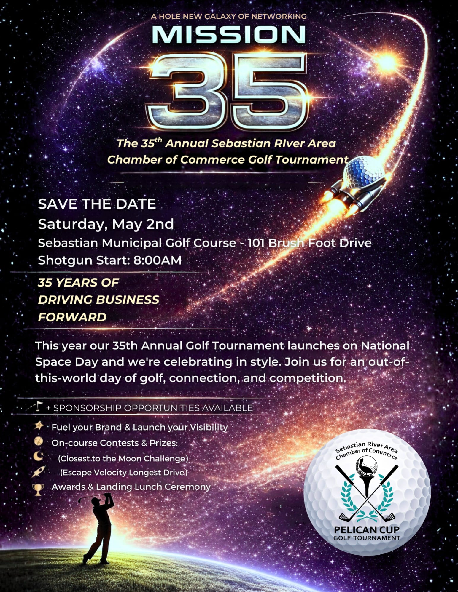 The Sebastian River Area Chamber of Commerce is proud to host its 35th Annual Pelican Cup Golf Tournament. This year's theme is Mission 35! Call the Chamber for Sponsorship Information, to Register your Team, or Sign Up as an Individual Player ($125).