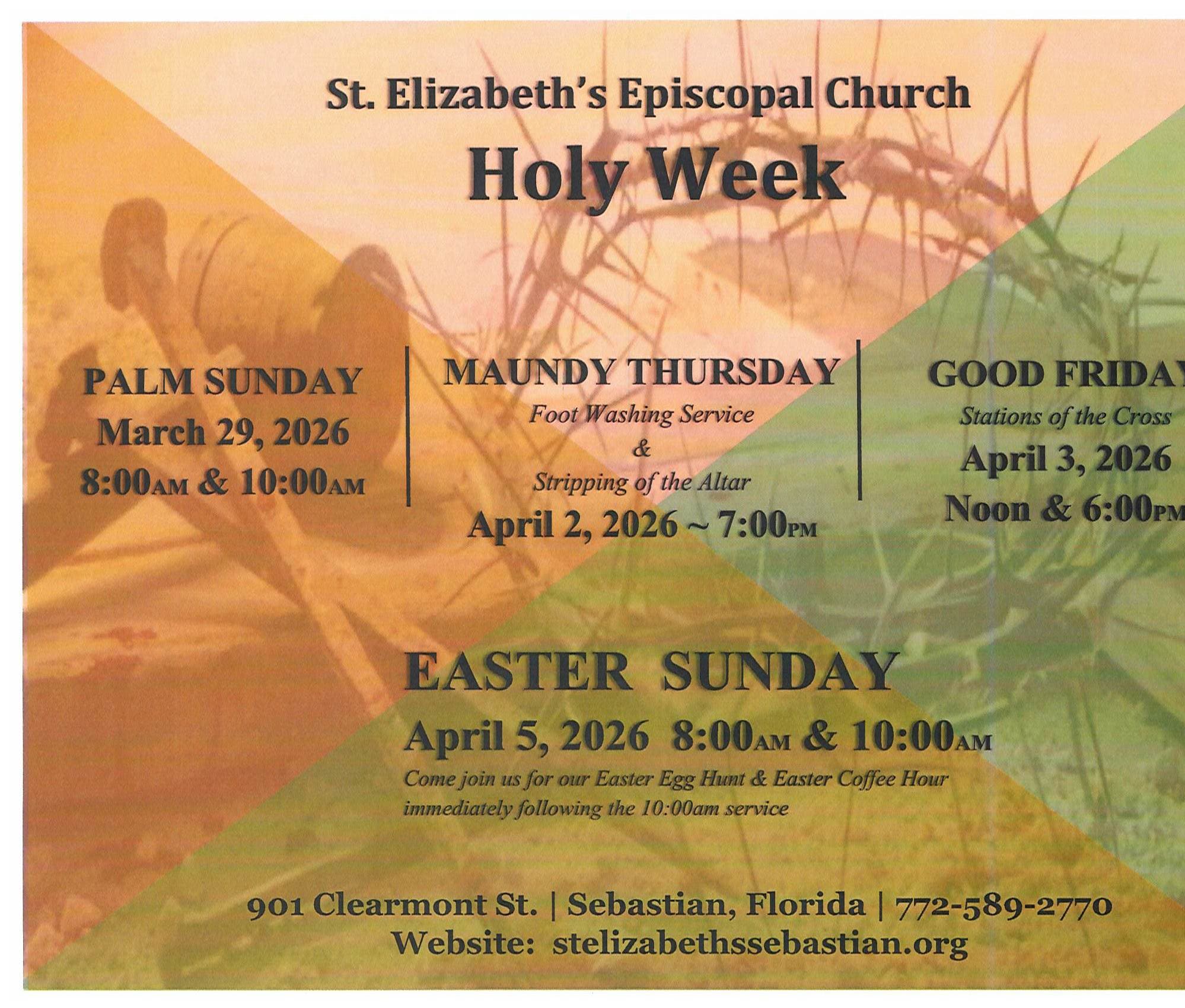 HOLY WEEK SCHEDULE 2026 Back to News Items HOLY WEEK SCHEDULE 2026 By St. Elizabeth's Episcopal Church 2/17/2026 Images × Share × Email Facebook LinkedIn X Pinterest Powered By GrowthZone