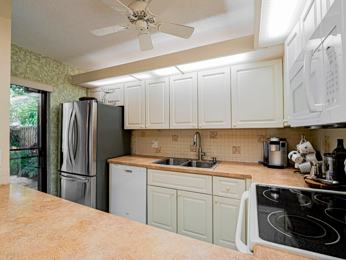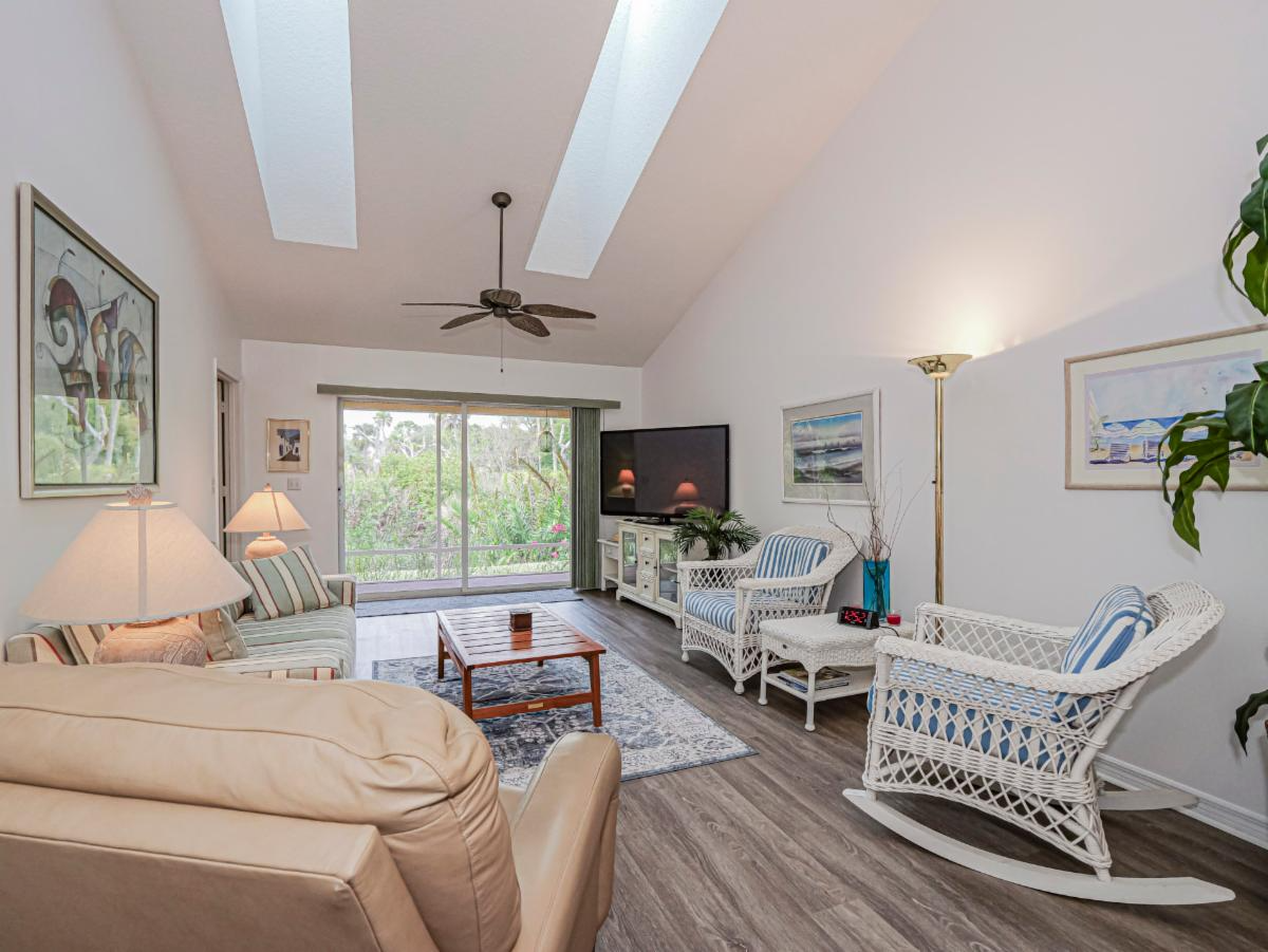 BEST location at Village Walk South. Backs to Nature Preserve! Newer roof on this renovated, turnkey, 2/2 split BR ranch. All furnishings, light fixtures, linens, beds, appliances & newer washer/dryer included! Newer luxury vinyl plank in living & dining area. Vaulted ceiling & newer skylights. Newer refrigerator & dishwasher. Kitchen with pantry. Complex is gated with pool & is just minutes to shops & beach. |