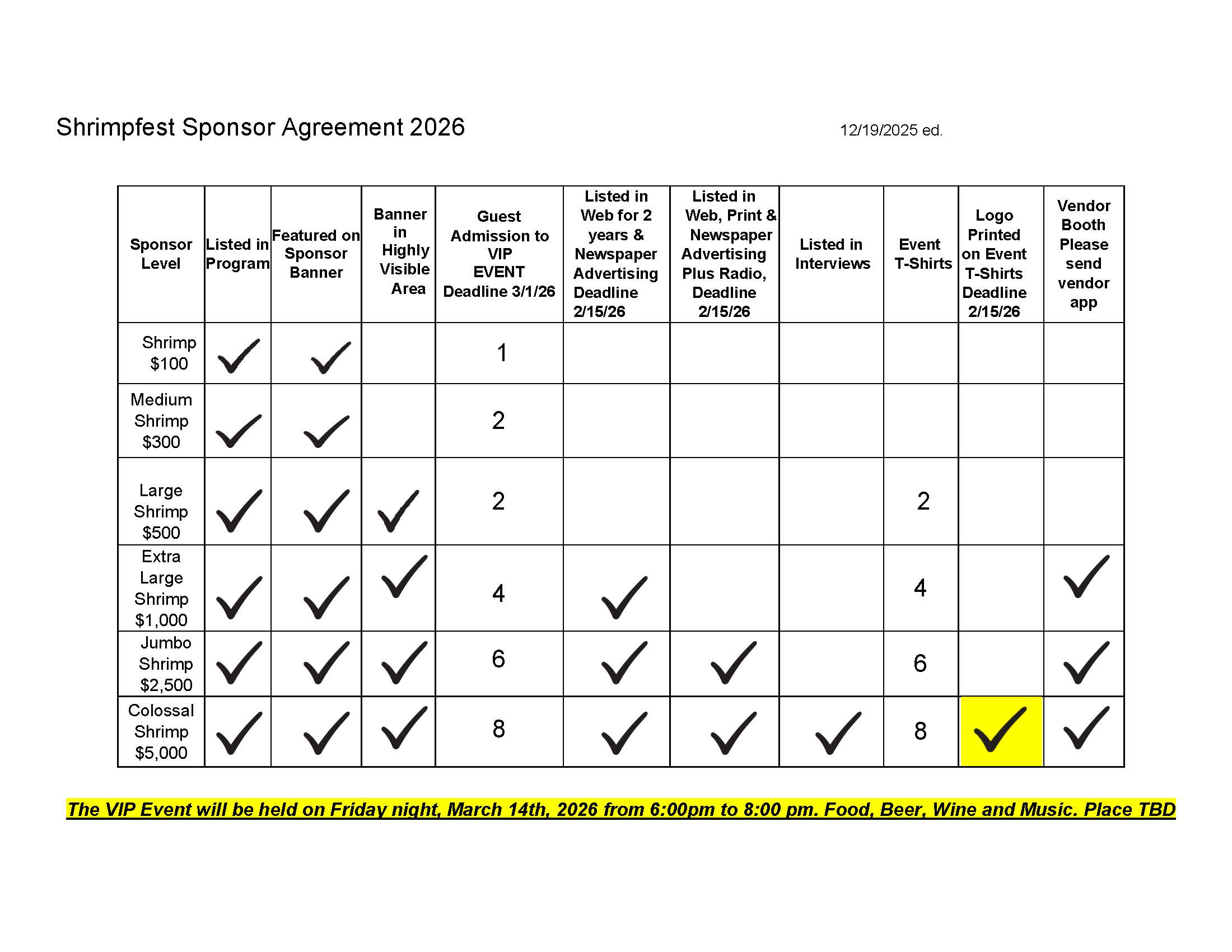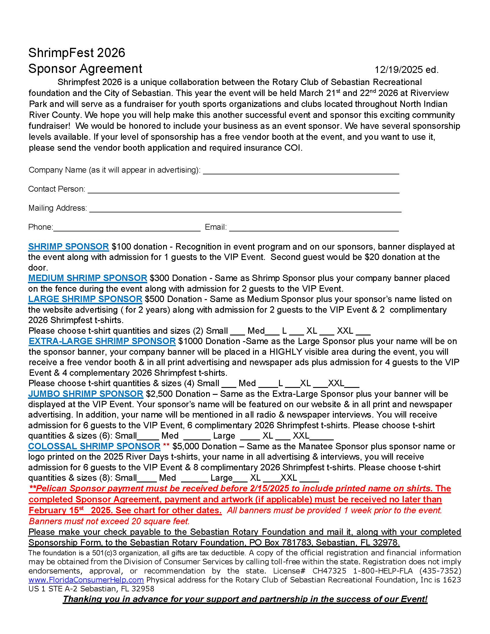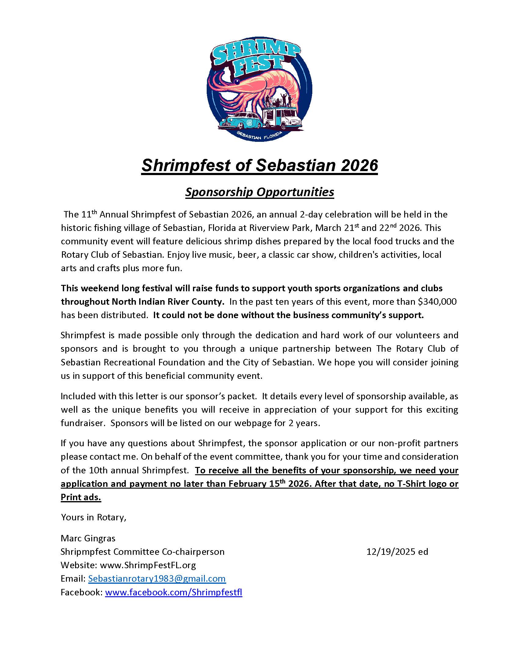 SHRIMPFEST OF SEBASTIAN 2026 | SPONSORSHIP OPPORTUNITIES & INFORMATION Back to News Items SHRIMPFEST OF SEBASTIAN 2026 | SPONSORSHIP OPPORTUNITIES & INFORMATION By Shrimpfest 1/21/2026 Images × Share × Email Facebook LinkedIn X Pinterest Powered By GrowthZone