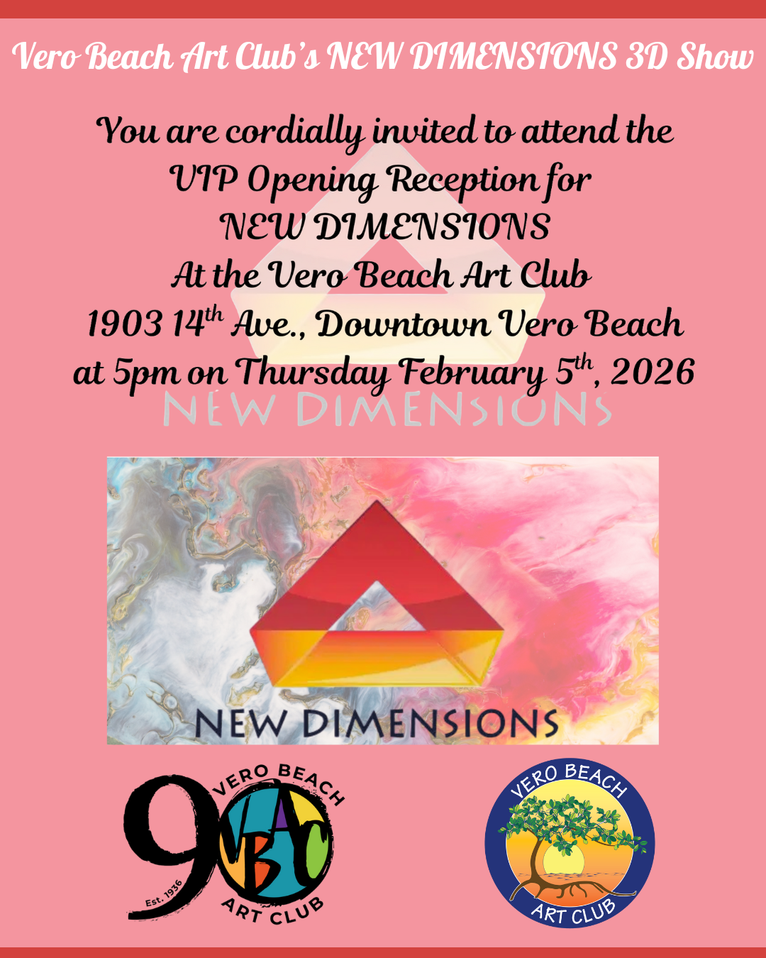 VERO BEACH ART CLUB | VIP OPENING RECEPTION FOR "NEW DIMENSIONS" 3D SHOW Back to News Items VERO BEACH ART CLUB | VIP OPENING RECEPTION FOR "NEW DIMENSIONS" 3D SHOW By Vero Beach Art Club 1/19/2026 On Behalf of Our Friends at the Vero Beach Art Club -- Please see the Attached Invite! Share This EmailShare This EmailShare This EmailMacEvoy Real Estate Co. | 2855 Ocean Drive, Suite C6 | Vero Beach , FL 32963 US Constant Contact Data Notice Images Images × Share × Email Facebook LinkedIn X Pinterest Powered By GrowthZone